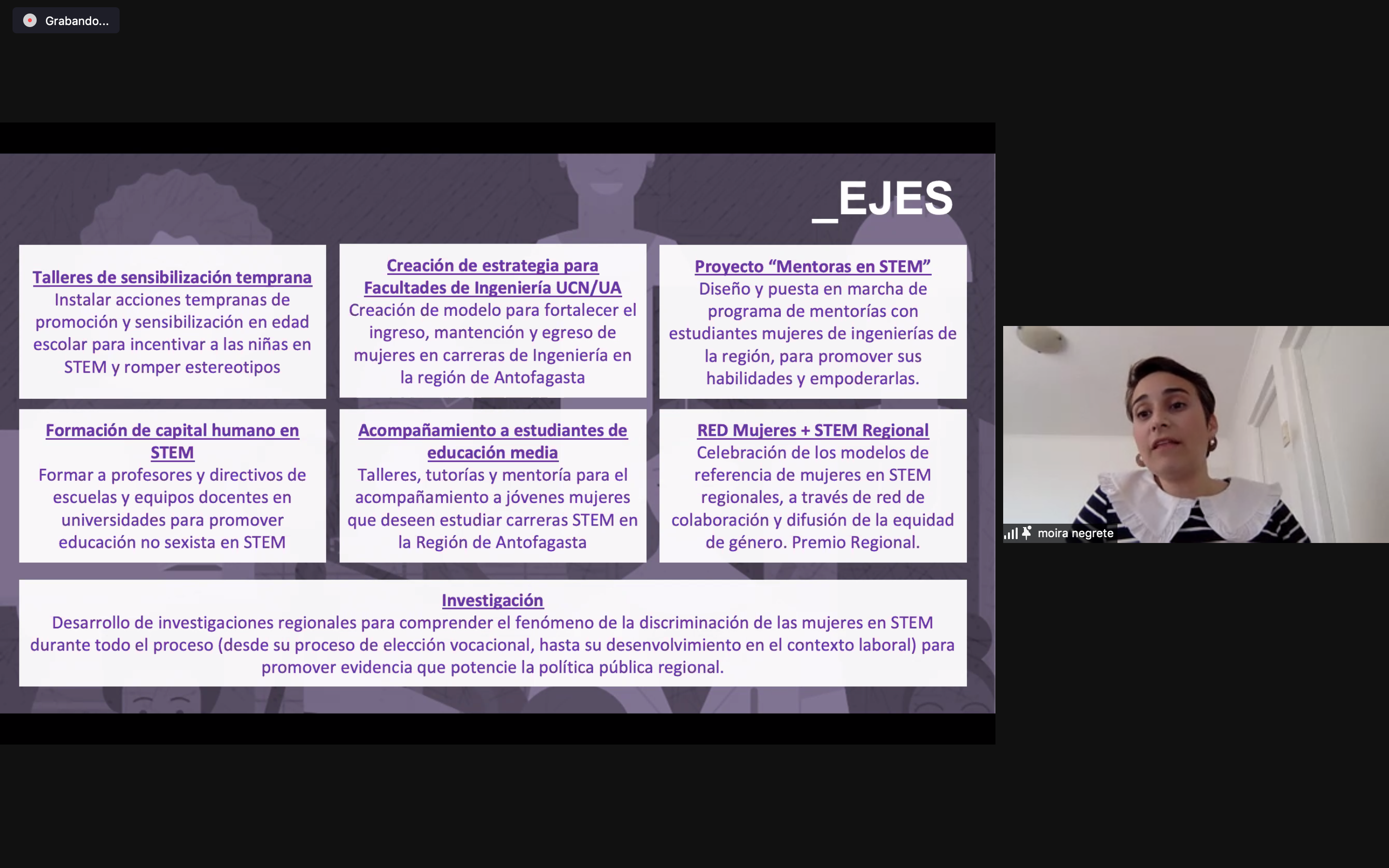 - Ejecución de un levantamiento de modelos de referencia y de tutoría desde estudiantes mujeres STEM prontas a la titulación y profesionales y emprendedoras regionales mujeres ligadas a la ingeniería ya egresadas desde universidades regionales que se encuentran inmersas en sectores productivos o científicos ligados a STEM (minería, energía e industria), con tal de dar visibilidad al rol de la mujer en STEM, desde casos reales de impacto, que puedan ser exhibidos a estudiantes en edades tempranas y estudiantes en proceso de formación en educación superior, favoreciendo el quiebre de estereotipos de género y la generación de expectativas erróneas ligadas a la materia. Además, se espera brindar formación y desarrollo profesional en materias críticas para estas estudiantes universitarias, ingenieras y emprendedoras regionales.