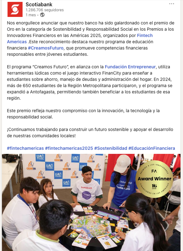 En reconocimiento al Proyecto Creamos Futuro: Aprende Finanzas Personales, Banco Scotiabank Chile recibe el Premio de Oro en los Premios a los Innovadores Financieros en las Américas 2025, en la categoría de Sostenibilidad y Responsabilidad Social, por parte de Fintech Americas, destacando el impacto del proyecto como programa corporativo de educación financiera dirigido a jóvenes estudiantes de Chile.
